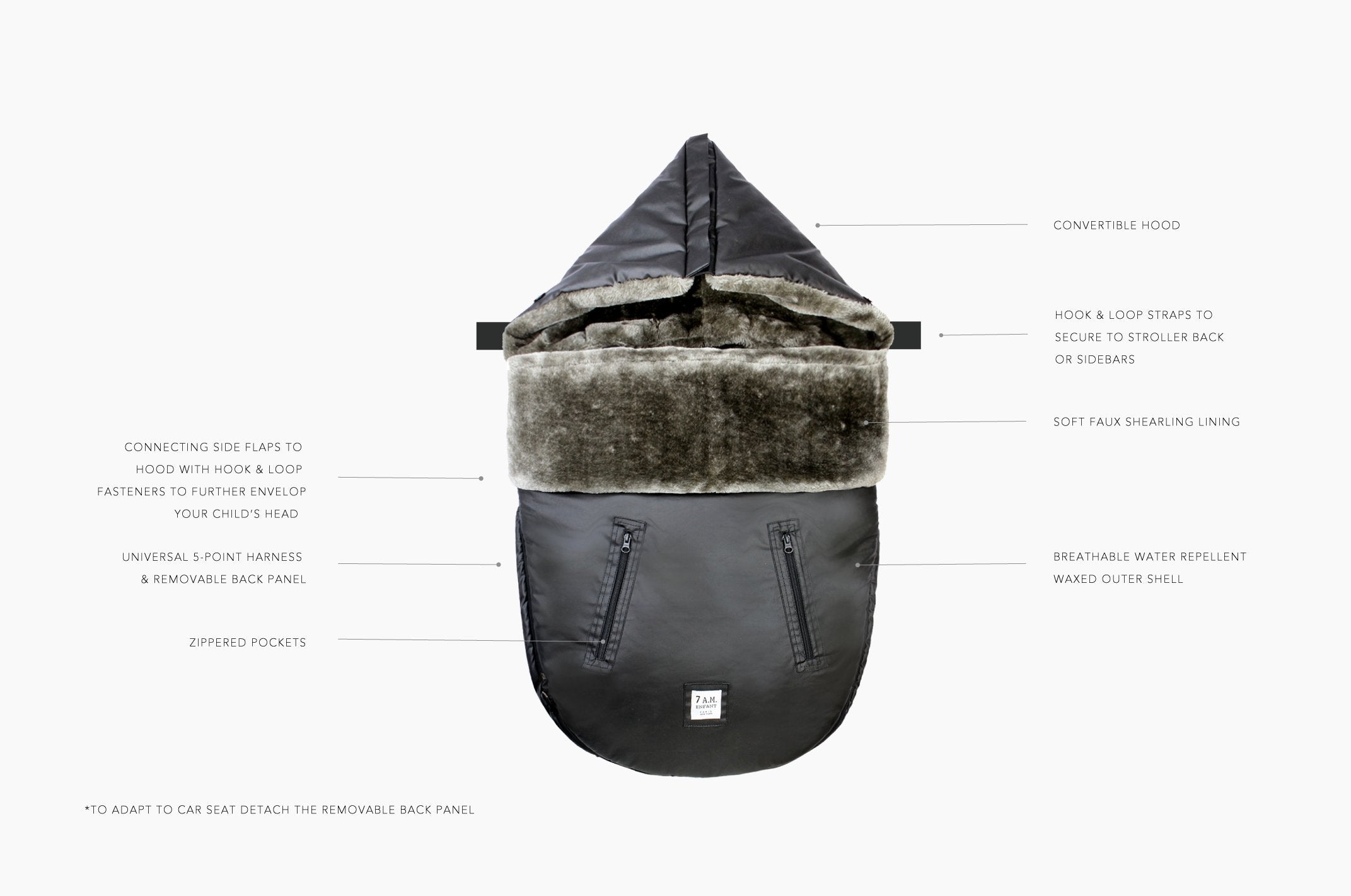 Imagine yourself in the countryside of Great Britain where cold, rain and wind rein; imagine strolling through the city streets or jogging through a mountainous path with your baby all bundled up in the WaxedPOD. To keep your little one safe and warm, the WaxedPOD will do just the trick. Adapt the WaxedPOD to your car seat or stroller thanks to the removable 5-point harness back panel. On warmer spring or fall days, this versatile sack has a detachable cover that turns into a faux shearling lined single-paneled blanket for the ultimate nap time.